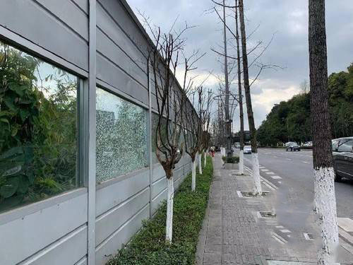 隔音屏與人行道之間間隔約0.6米寬的綠化帶,破損玻璃存在一定安全隱患,也影響市容市貌。而玻璃破損有段時(shí)間了,不見有人前來維修更換。